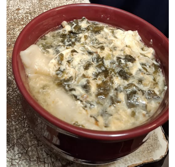 3) Break eggs in a bowl, briefly beat with serving fork then swirl eggs into the soup on medium heat.