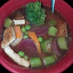 Peas, carrots, okra, beets, broccoli, cauliflower and tofu in a vinegary chili garlic tamarind hoisin broth